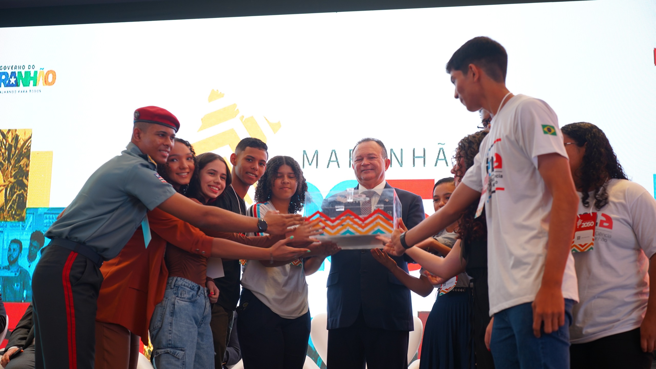 Durante o lançamento do plano, o governador Carlos Brandão recebeu uma cápsula do tempo das mãos de alunos da rede pública estadual de educação com as redações da campanha “O Maranhão que queremos”, que expressam sonhos e desejos dos estudantes para o futuro do estado.